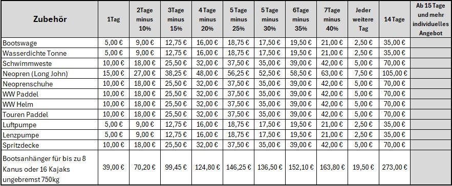 | Touren Paddel | 10,- € | 18,- € | 25,- € | 32 ,- € | 37,- € | 42,- € | 45,- € | 5,- € | 70,- € | |