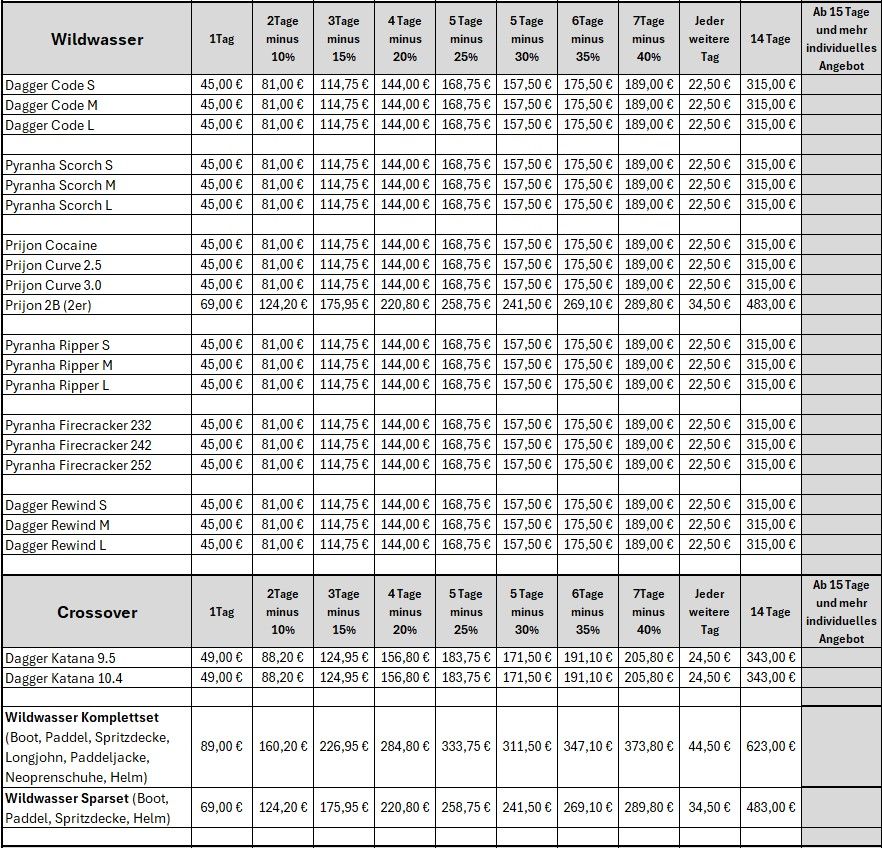 | WW Paddel | 10,- € | 18,- € | 25,- € | 32 ,- € | 37,- € | 42,- € | 45,- € | 5,- € | 70,- € | |