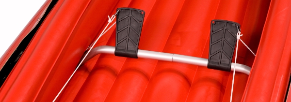 - Für die Passagiere stehen 2 massive Dural Fußstemmbügel zur Verfügung. Diese können je nach Bedarf (bei reduziertem Bodenluftdruck) stufenlos längsverstellt werden. Der rückwärtige Bügel ist mit Anschlägen für die Pedale der Steuervorrichtung bzw. Heck-Elektromotor ausgestattet.