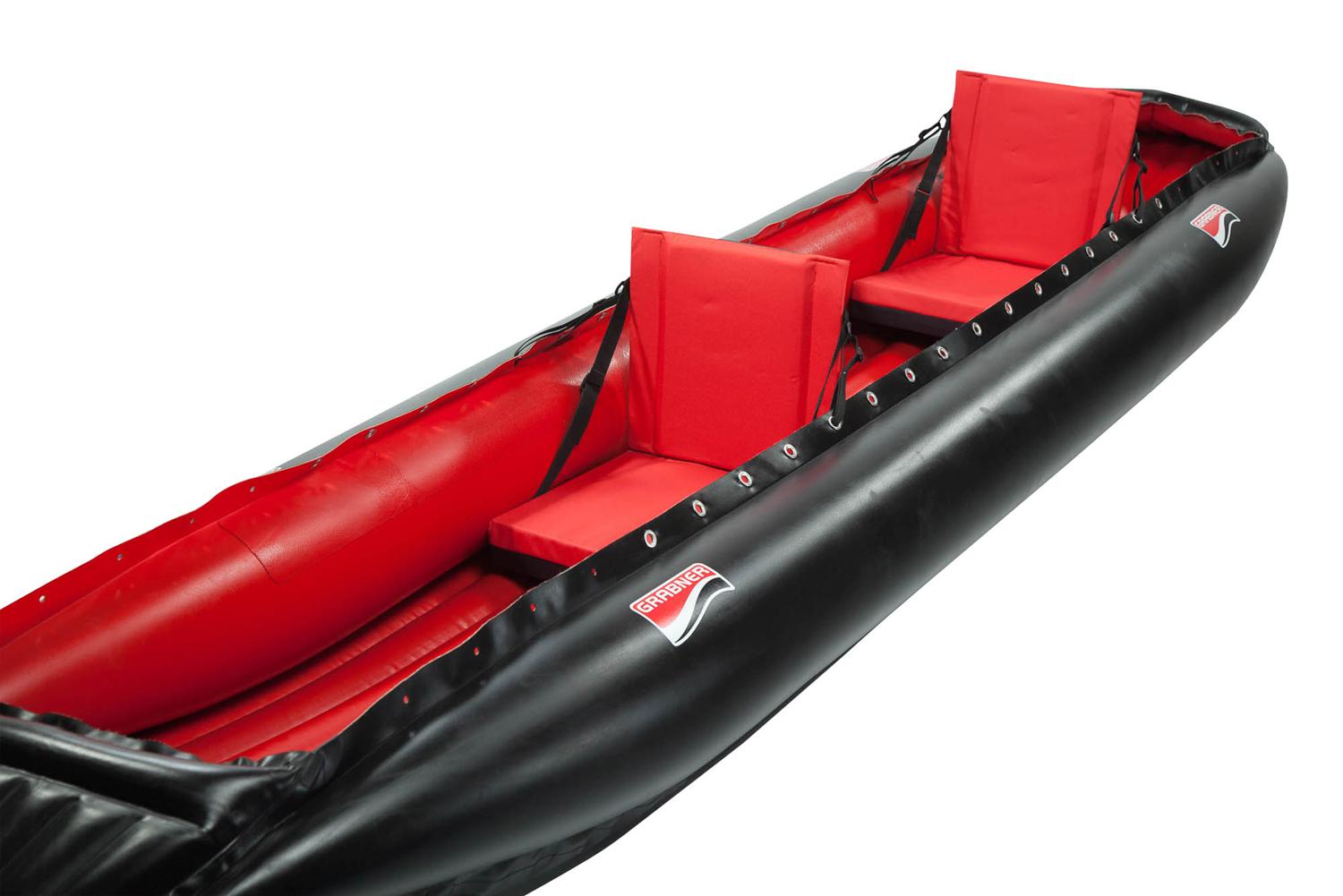 Grabner Holiday 3 Das HOLIDAY 3 ist das ideale Boot für 3 Erwachsene oder für Eltern mit 1 bis 2 Kindern. Aber auch für 2 Erwachsene mit ausreichend Platz für voluminöses Reisegepäck oder als superlanger 1-Sitzer.Das HOLIDAY 3 ist serienmäßig mit 2 Kajaksitzen ausgestattet ist. Das garantiert bequemes Sitzen und eine komfortable Rückenlehne.Das HOLIDAY ist zum Wasserwandern auf Flüssen, Seen und Küsten das ideale Boot. Es hat ideale Gleit- und Fahreigenschaften und ein hohes Komfort- und Platzangebot. Das Holiday 3 besitzt folgende Merkmale: Der Boden ist weitgehend unempfindlich bei Grundberührung und läuft durch geringen Tiefgang auch im seichten Wasser. Die zwei hohen Seitenbordwände stabilisieren das Boot und schützen vor Spritzwasser. Der Bug ist mit kräftigen Kunststoffleisten verstärkt. Unter dem Bug- und Heckverdeck ist Platz für Gepäck und Ausrüstung. Die schmalen Bodenwülste sind bequem zum Sitzen und Liegen und verleihen dem Boot eine tiefe kentersichere Schwerpunktlage. Die Kajaksitze garantieren höchsten Sitzkomfort. Mit weich gepolsterter Sitzfläche, gepolstertem Rücken, Versteifungsprofile, durch Gurten längs- und neigungsverstellbar. Die 8 seitlichen Sitzhalter sind wahlweise für 1- oder 2-Sitzer (3-Sitzer) zu verwenden. Im Niro Heck-Einsteckteil kann die Steuerung oder Torqeedo Heckmotor sehr stabil befestigt werden. Bei den HOLIDAY Luxusmodellen sorgen ein handlicher Bug- und Heck-Tragegriff für leichten Transport an Land und für bequemes Wassern. Entlang der beiden Verdecke sind Sicherheitsleinen angebracht. Diese ermöglichen leichtes Tragen in schwierigem Gelände und Festhalten bei einer Kenterung. Für die Passagiere stehen 2 massive Dural Fußstemmbügel zur Verfügung. Diese können je nach Bedarf (bei reduziertem Bodenluftdruck) stufenlos längsverstellt werden. Der rückwärtige Bügel ist mit Anschlägen für die Pedale der Steuervorrichtung bzw. Heck-Elektromotor ausgestattet.