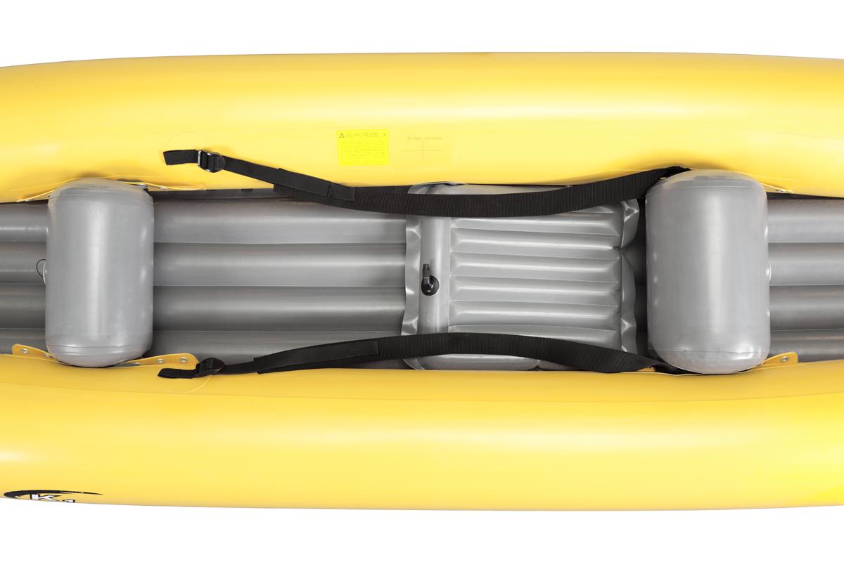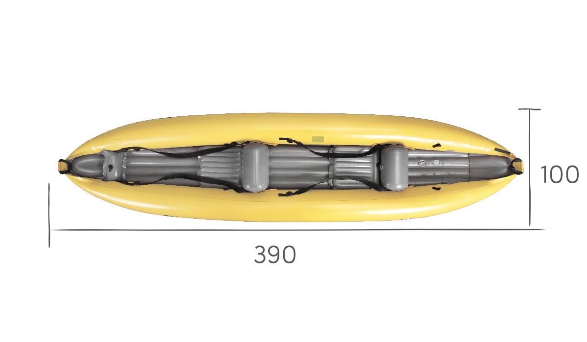 Gumotex Rush 2 Eine Buglänge voraus! Die innovative Hybrid-Konstruktion aus Luftkammer-System und stabilisierender Drop-Stitch Technologie, verleiht dem aufblasbaren Kajak seine einzigartige hydrodynamische Form und Steifigkeit. Das Ergebnis: Eine exzellente Wasserlage, leichte Manövrierbarkeit und schnelle Laufeigenschaft. Nicht nur auf dem Wasser lässt es sich leicht manövrieren: Auch an Land ist es, dank geringem Gewicht und kleinem Packmaß, einfach zu transportieren. Nehmen Sie Platz und genießen Sie maximalen Sitzkomfort. Die bequemen Sitze und Fußstützen sorgen in Kombination mit einer großzügig bemessenen Beinfreiheit dafür, dass Sie auch bei langen Touren entspannt an’s Ziel kommen.Maximale Flexibilität: Allein paddeln, oder zu zweit? RUSH bietet Ihnen durch das durchdachte Sitz-Beschlagsystem die Möglichkeit zur individuellen Sitzverstellung/-installation.Ob für den Einsatz auf dem See, Meer, in Küstennähe oder auf dem Fluss (bis WW Stufe 2): Das Kajak lässt sich nicht nur vielseitig einsetzen, sondern mit weiterem Zubehör, wie einem abnehmbaren Verdeck und einer Steueranlage, ganz nach Ihren Wünschen ausstatten.