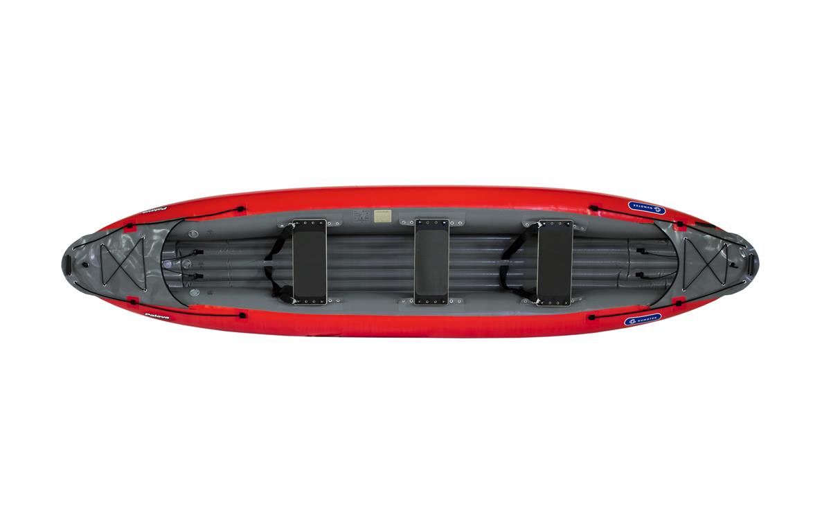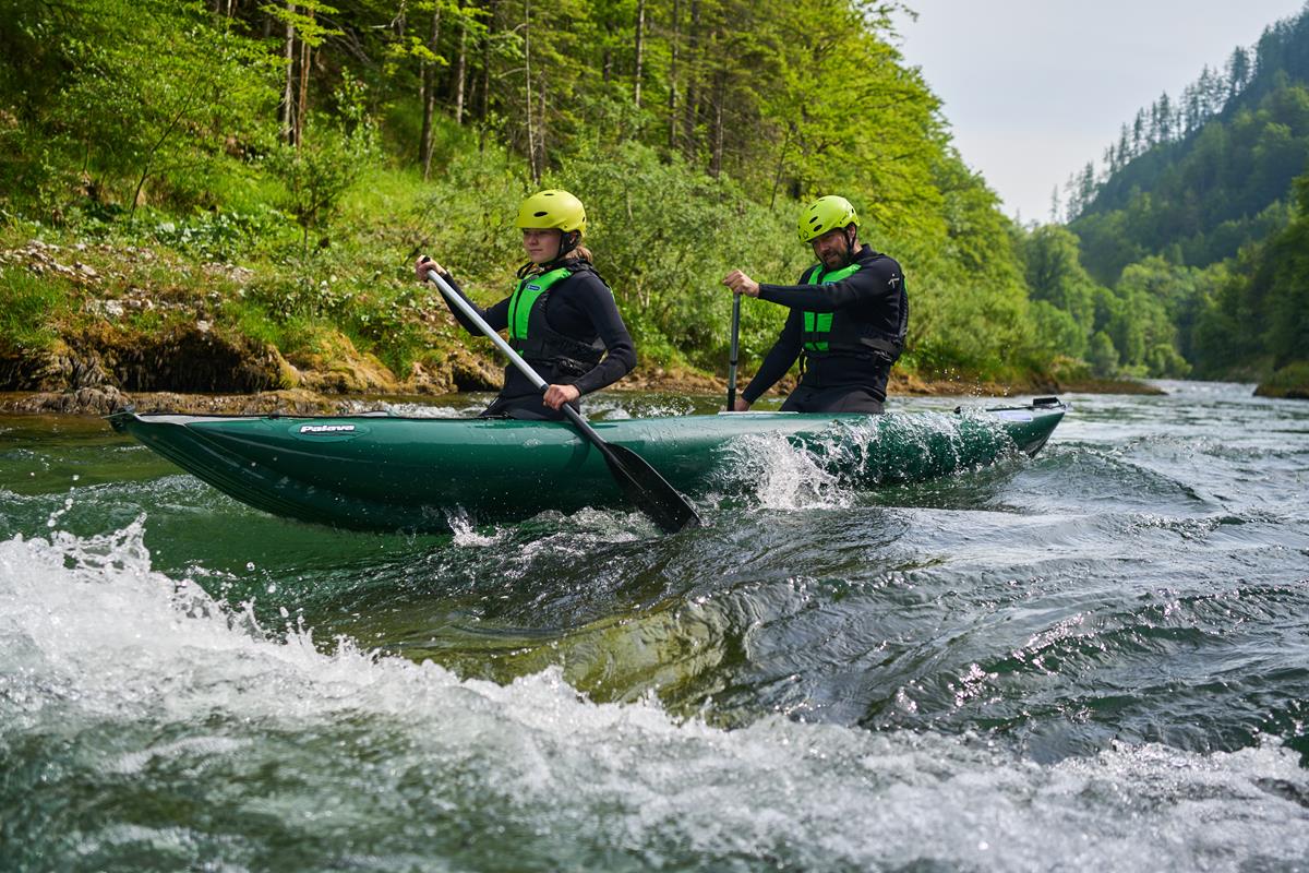 Das neue, wendige PALAVA gewinnt an Länge und optimierten Fahrverhalten, welche sich in der Fahrstabilität und einem schnelleren Geradeauslauf widerspiegeln. Auf der hinzugewonnen Länge lässt sich problemlos ein dritter Sitz montieren und das Gepäck sicher verstauen. Ob Fließgewässer oder leichtes Wildwasser (WW3) – Je nach Einsatzgebiet und persönlicher Vorliebe, kann es sowohl sitzend als auch kniend gepaddelt werden. Die Schenkelgurte geben sicheren Halt beim Durchfahren von Stromschnellen. Einfaches Handling verspricht das Boot auch an Land. Es lässt sich innerhalb kürzester Zeit auf- und abbauen und, dank des geringen Gewicht und Packmaß, auch in öffentlichen Verkehrsmitteln, in dem mitgelieferten Packsack, transportieren.