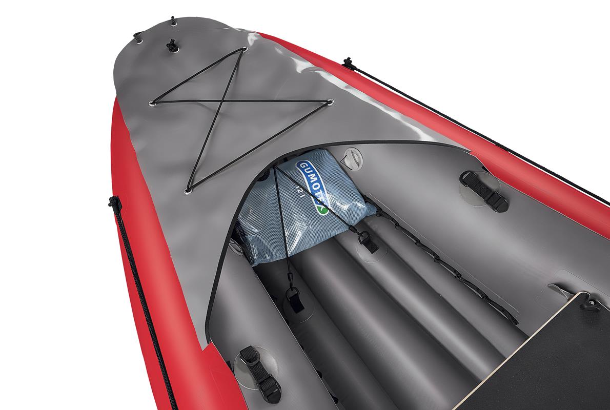 Gumotex Rush 2 Eine Buglänge voraus! Die innovative Hybrid-Konstruktion aus Luftkammer-System und stabilisierender Drop-Stitch Technologie, verleiht dem aufblasbaren Kajak seine einzigartige hydrodynamische Form und Steifigkeit. Das Ergebnis: Eine exzellente Wasserlage, leichte Manövrierbarkeit und schnelle Laufeigenschaft. Nicht nur auf dem Wasser lässt es sich leicht manövrieren: Auch an Land ist es, dank geringem Gewicht und kleinem Packmaß, einfach zu transportieren. Nehmen Sie Platz und genießen Sie maximalen Sitzkomfort. Die bequemen Sitze und Fußstützen sorgen in Kombination mit einer großzügig bemessenen Beinfreiheit dafür, dass Sie auch bei langen Touren entspannt an’s Ziel kommen.Maximale Flexibilität: Allein paddeln, oder zu zweit? RUSH bietet Ihnen durch das durchdachte Sitz-Beschlagsystem die Möglichkeit zur individuellen Sitzverstellung/-installation.Ob für den Einsatz auf dem See, Meer, in Küstennähe oder auf dem Fluss (bis WW Stufe 2): Das Kajak lässt sich nicht nur vielseitig einsetzen, sondern mit weiterem Zubehör, wie einem abnehmbaren Verdeck und einer Steueranlage, ganz nach Ihren Wünschen ausstatten.