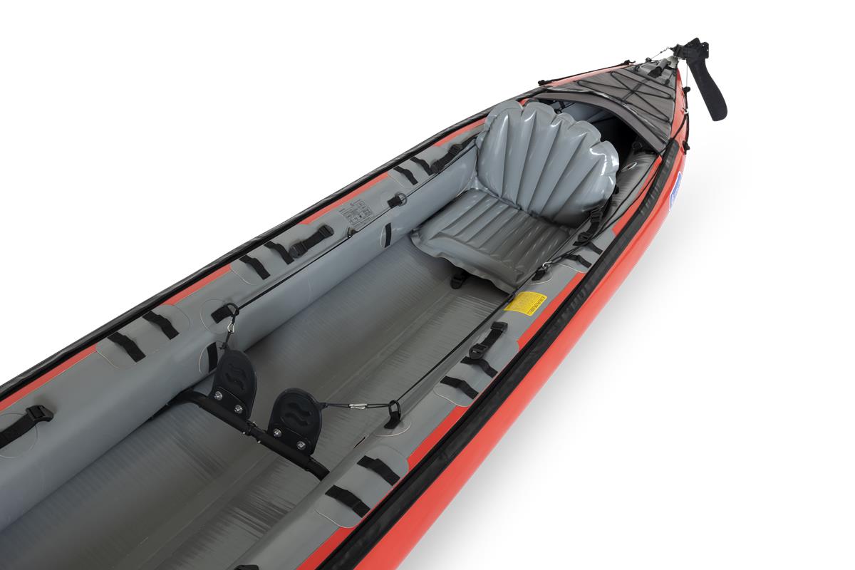 Gumotex Rush 2 Eine Buglänge voraus! Die innovative Hybrid-Konstruktion aus Luftkammer-System und stabilisierender Drop-Stitch Technologie, verleiht dem aufblasbaren Kajak seine einzigartige hydrodynamische Form und Steifigkeit. Das Ergebnis: Eine exzellente Wasserlage, leichte Manövrierbarkeit und schnelle Laufeigenschaft. Nicht nur auf dem Wasser lässt es sich leicht manövrieren: Auch an Land ist es, dank geringem Gewicht und kleinem Packmaß, einfach zu transportieren. Nehmen Sie Platz und genießen Sie maximalen Sitzkomfort. Die bequemen Sitze und Fußstützen sorgen in Kombination mit einer großzügig bemessenen Beinfreiheit dafür, dass Sie auch bei langen Touren entspannt an’s Ziel kommen.Maximale Flexibilität: Allein paddeln, oder zu zweit? RUSH bietet Ihnen durch das durchdachte Sitz-Beschlagsystem die Möglichkeit zur individuellen Sitzverstellung/-installation.Ob für den Einsatz auf dem See, Meer, in Küstennähe oder auf dem Fluss (bis WW Stufe 2): Das Kajak lässt sich nicht nur vielseitig einsetzen, sondern mit weiterem Zubehör, wie einem abnehmbaren Verdeck und einer Steueranlage, ganz nach Ihren Wünschen ausstatten.