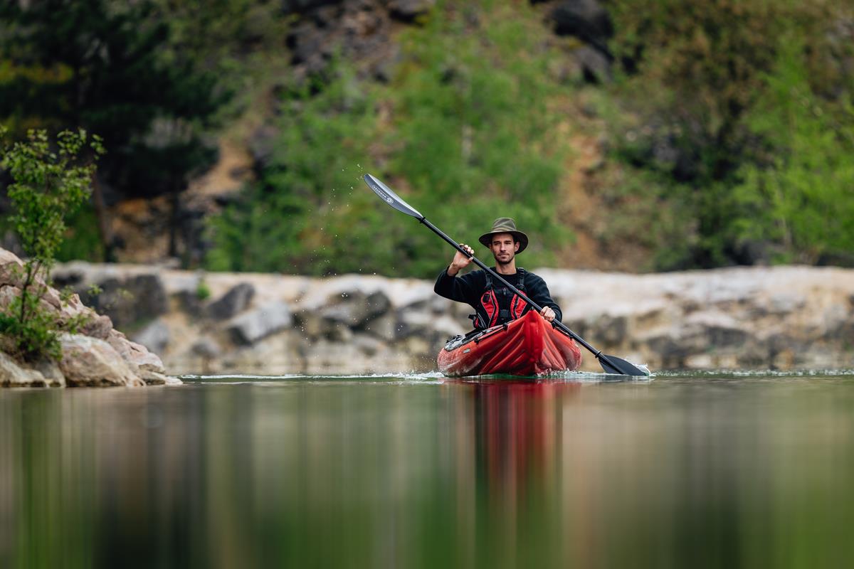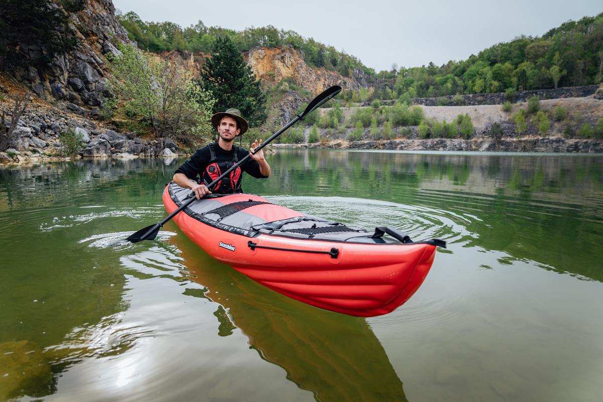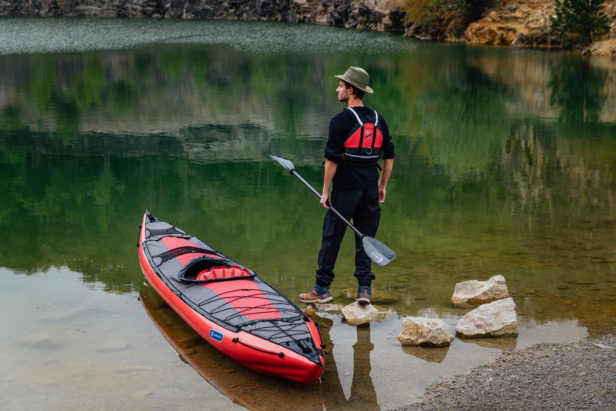 Grabner Escape 1 Auf Fluss, See und Meer. Das professionelle Boot für Solopaddler ist ein reinrassiges Tourenkajak für Flüsse, Seen und Küstenabstecher rund ums Ferienparadies. Dank reichlichem Stauraum eignet sich das aufblasbare Kajak perfekt für mehrtägige Touren am großen Strom. Der perfekte Urlaubstraum aus dem Kofferraum, der auch im Zug- oder Fluggepäck Platz findet. Aufpumpen und darauf abfahren – das universelle Reisekajak für viele Ziele.Das BootIn bester Gleitform.Sportlich schlank präsentiert sich der vielseitige ESCAPE 1 im schnittigen Design für uneingeschränkte Entdeckungsreisen.Lang gezogenMühelos schnell gleitet der ESCAPE übers Wasser. Die lange Wasserlinie von 420 cm bietet geringen Widerstand, sowie zusätzlichen Platz für Tourengepäck im Inneren.Kontrolle aus der HüfteDer V-förmige Querschnitt, mit nach unten versetztem Boden und ausgeprägtem Mittelwulst, bietet geringsten Widerstand für leichten Lauf und spurstabiles Kurshalten.Die prägnanten oberen Seitenteile bieten gleich zwei Vorteile:1. Guten Hüftkontakt beim Sitzen,2. sowie viel Auftrieb beim Aufkanten.Damit Sie in jeder Situation, die Kontrolle behalten!Verdeck für ProfisUnter dem fix mit dem Boot verbundenen Verdeck, aus echter Grabner Gummi Bootshaut, bleibt man immer trocken! Nach dem Paddeln perlt Spritzwasser ab und das Boot kann trocken verpackt werden. Bei wilderen Passagen oder an kalten Tagen kann die Luke mit einer optionalen Wildwasserschürze geschlossen werden. Dank des flachen Verdecks hat Seitenwind weniger Angriffsfläche, für leichten Lauf auch an windigen Tagen. Die inneren Werte zählen. Was muss alles mit auf längere Reisen? Maßgeschneiderte wasserdichte Taschen für viel Gepäck, passen perfekt in Bug und Heck. Unter dem Verdeck zeigt sich: Der ESCAPE ist ein echtes Raumwunder! Zusätzlich können auch auf dem Verdeck Taschen angebracht werden. Für tagelange Touren ohne Entbehrungen.Immer griffbereitDas serienmäßige Bugnetz hält Trinkflaschen und vieles mehr immer griffbereit. Mit kleinen Häkchen kann eine wasserdichten Bug-/Hecktasche darüber fixiert werden.Stabiler SitzDer Sitz ist maßgeschneidert für die Anforderungen im ESCAPE. Die flache Sitzfläche garantiert einen tiefen Schwerpunkt, für höchste Kippstabilität auch im bewegten Wasser. Die Sitzlehne kann im gewünschten Winkel und Härte eingestellt werden. Für den gemütlichen Paddler ist optional auch die beliebte erhöhte Rückenstützlehne erhältlich.Guter HaltDer stufenlos einstellbare Fußstemmbügel bietet guten Halt im Boot, erleichtert die richtige Körperhaltung und wird serienmäßig mitgeliefert.Fest im GriffInnerhalb der Sitzluke befindet sich links und rechts je ein Griff. Wenn man das Kajak alleine auf der Schulter trägt, behält man es fest im Griff.Bug und LeineDie besonders kräftige Schutzleiste am Bug absorbiert Anprallkräfte und schützt das Boot beim Kontakt mit Steinen oder Felsen.Heck und Halterung Der serienmäßige Heckbeschlag erlaubt das Anbringen von optionaler Steuervorrichtung oder Elektromotor. Lieferumfang: 1 Sitz ESCAPE 1 Stemmbügel 1 Bugnetz 4 Querstreben 1 Überdruckadapter 1 Reparaturset 1 Eigner-Handbuch mit Konformitätserklärung