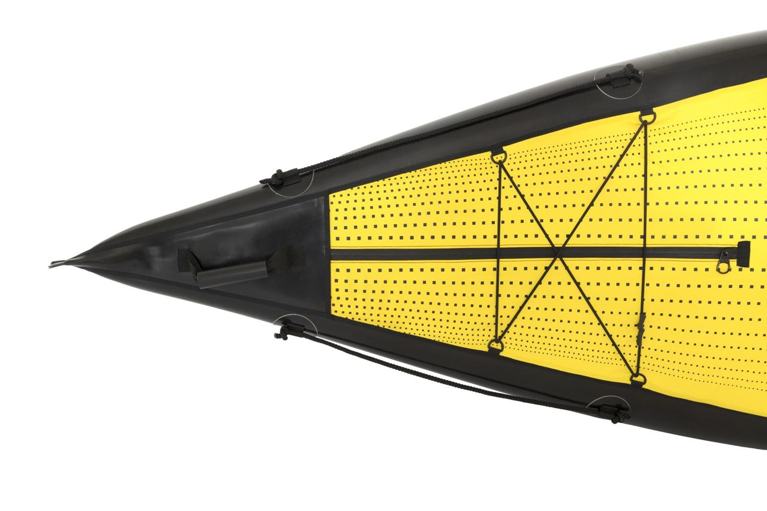 Gumotex Rush 2 Eine Buglänge voraus! Die innovative Hybrid-Konstruktion aus Luftkammer-System und stabilisierender Drop-Stitch Technologie, verleiht dem aufblasbaren Kajak seine einzigartige hydrodynamische Form und Steifigkeit. Das Ergebnis: Eine exzellente Wasserlage, leichte Manövrierbarkeit und schnelle Laufeigenschaft. Nicht nur auf dem Wasser lässt es sich leicht manövrieren: Auch an Land ist es, dank geringem Gewicht und kleinem Packmaß, einfach zu transportieren. Nehmen Sie Platz und genießen Sie maximalen Sitzkomfort. Die bequemen Sitze und Fußstützen sorgen in Kombination mit einer großzügig bemessenen Beinfreiheit dafür, dass Sie auch bei langen Touren entspannt an’s Ziel kommen.Maximale Flexibilität: Allein paddeln, oder zu zweit? RUSH bietet Ihnen durch das durchdachte Sitz-Beschlagsystem die Möglichkeit zur individuellen Sitzverstellung/-installation.Ob für den Einsatz auf dem See, Meer, in Küstennähe oder auf dem Fluss (bis WW Stufe 2): Das Kajak lässt sich nicht nur vielseitig einsetzen, sondern mit weiterem Zubehör, wie einem abnehmbaren Verdeck und einer Steueranlage, ganz nach Ihren Wünschen ausstatten.