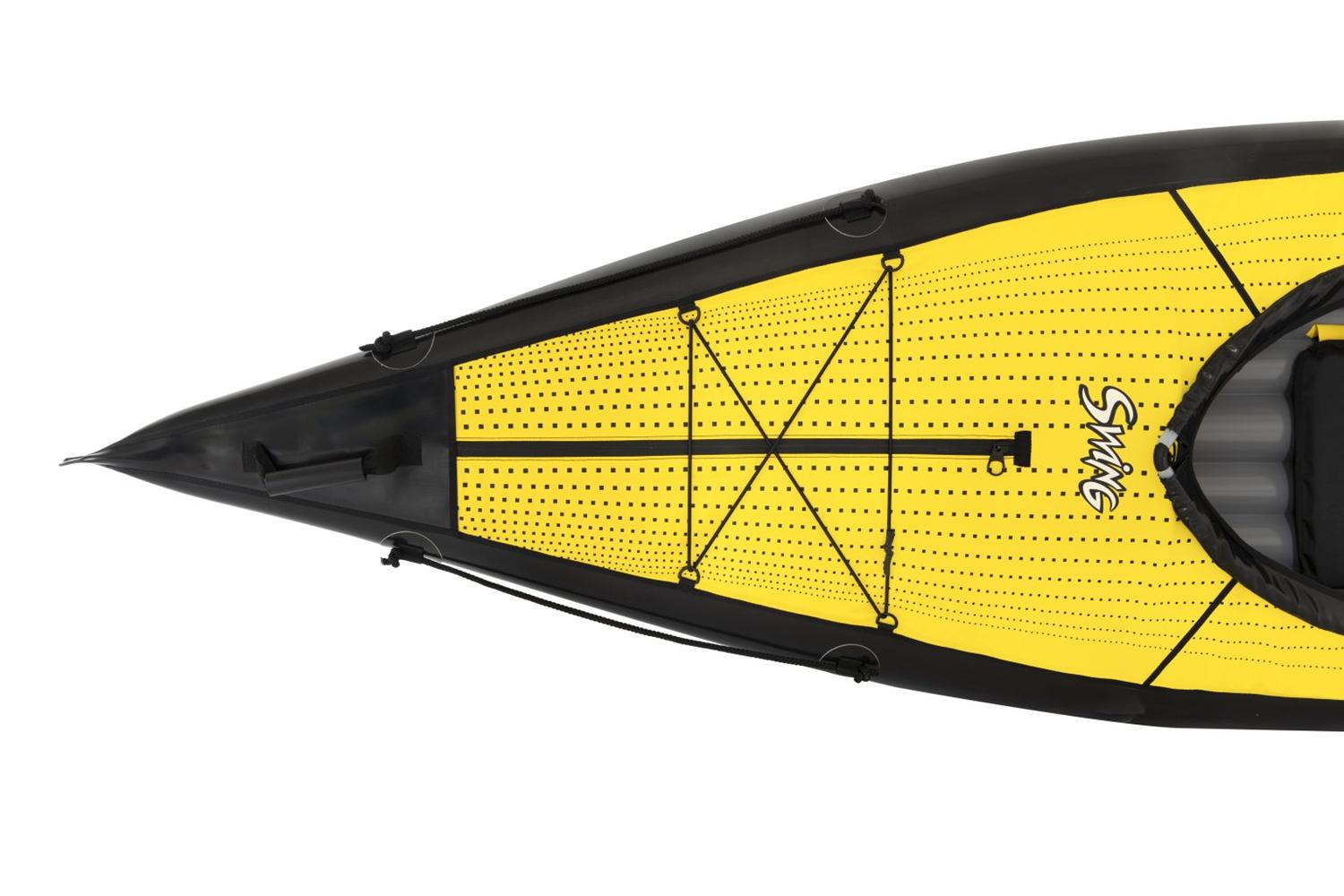 Zwei Aluminium-Verstärkungen sorgen für eine hervorragende Steifigkeit des Rumpfes und verbessern sowohl das Fahrverhalten als auch die Manövrierbarkeit. Gleichzeitig formen sie das geschlossene Deck, das zuverlässig verhindert, dass Wasser ins Innere gelangt. Mit nur 11,3 kg Gewicht ist das SWING 1 ein echtes Leichtgewicht und damit perfekt für Touren mit häufigem Umtragen des Kajaks.