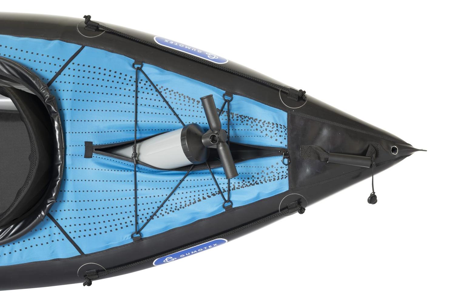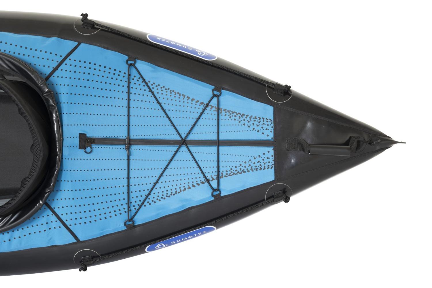 Gumotex Rush 2 Eine Buglänge voraus! Die innovative Hybrid-Konstruktion aus Luftkammer-System und stabilisierender Drop-Stitch Technologie, verleiht dem aufblasbaren Kajak seine einzigartige hydrodynamische Form und Steifigkeit. Das Ergebnis: Eine exzellente Wasserlage, leichte Manövrierbarkeit und schnelle Laufeigenschaft. Nicht nur auf dem Wasser lässt es sich leicht manövrieren: Auch an Land ist es, dank geringem Gewicht und kleinem Packmaß, einfach zu transportieren. Nehmen Sie Platz und genießen Sie maximalen Sitzkomfort. Die bequemen Sitze und Fußstützen sorgen in Kombination mit einer großzügig bemessenen Beinfreiheit dafür, dass Sie auch bei langen Touren entspannt an’s Ziel kommen.Maximale Flexibilität: Allein paddeln, oder zu zweit? RUSH bietet Ihnen durch das durchdachte Sitz-Beschlagsystem die Möglichkeit zur individuellen Sitzverstellung/-installation.Ob für den Einsatz auf dem See, Meer, in Küstennähe oder auf dem Fluss (bis WW Stufe 2): Das Kajak lässt sich nicht nur vielseitig einsetzen, sondern mit weiterem Zubehör, wie einem abnehmbaren Verdeck und einer Steueranlage, ganz nach Ihren Wünschen ausstatten.