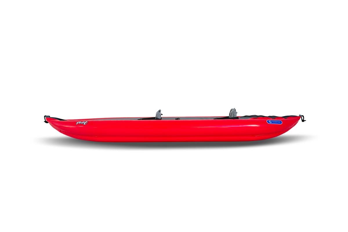 Gumotex Rush 2 Eine Buglänge voraus! Die innovative Hybrid-Konstruktion aus Luftkammer-System und stabilisierender Drop-Stitch Technologie, verleiht dem aufblasbaren Kajak seine einzigartige hydrodynamische Form und Steifigkeit. Das Ergebnis: Eine exzellente Wasserlage, leichte Manövrierbarkeit und schnelle Laufeigenschaft. Nicht nur auf dem Wasser lässt es sich leicht manövrieren: Auch an Land ist es, dank geringem Gewicht und kleinem Packmaß, einfach zu transportieren. Nehmen Sie Platz und genießen Sie maximalen Sitzkomfort. Die bequemen Sitze und Fußstützen sorgen in Kombination mit einer großzügig bemessenen Beinfreiheit dafür, dass Sie auch bei langen Touren entspannt an’s Ziel kommen.Maximale Flexibilität: Allein paddeln, oder zu zweit? RUSH bietet Ihnen durch das durchdachte Sitz-Beschlagsystem die Möglichkeit zur individuellen Sitzverstellung/-installation.Ob für den Einsatz auf dem See, Meer, in Küstennähe oder auf dem Fluss (bis WW Stufe 2): Das Kajak lässt sich nicht nur vielseitig einsetzen, sondern mit weiterem Zubehör, wie einem abnehmbaren Verdeck und einer Steueranlage, ganz nach Ihren Wünschen ausstatten.