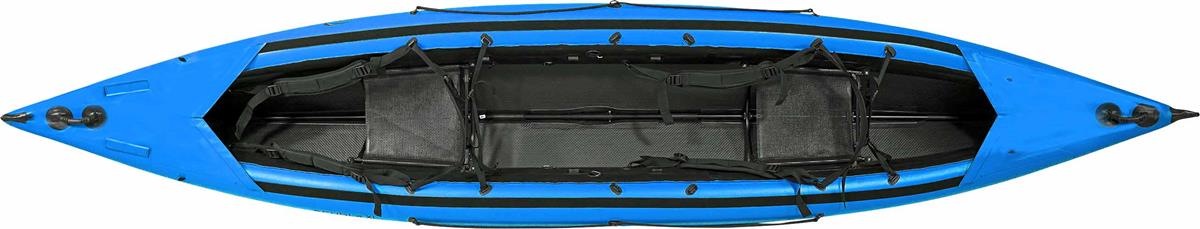 Eine Vielzahl an Zubehör. Der optional erhältliche und variabel einsetzbare mittlere Sitz bietet einem Kleinkind einen Sitzplatz, bei dem es in Richtung Hintermann blickt. Ein größeres Kind, welches selbst schon mitpaddeln möchte, kann in Fahrtrichtung Platz nehmen. Darüber hinaus lässt sich eine ideale Mittelposition im Solo-Einsatz einnehmen. Dank des optionalen Verdecks, welches über zwei Cockpits mit festen Süllrändern verfügt, lassen sich Schürzen stabil anbringen und Sie sind so bestens gegen Spritzwasser geschützt. Eine Besonderheit bietet der Drop-Stitch Einlegeboden, der optional eingesetzt werden kann. Dieser erzeugt einen festen und steifen Rumpf – die richtungsweisende Kielausprägung bleibt allerdings erhalten. Im unaufgepumpten Zustand findet er kompakt zusammengelegt in der Packtasche Platz.