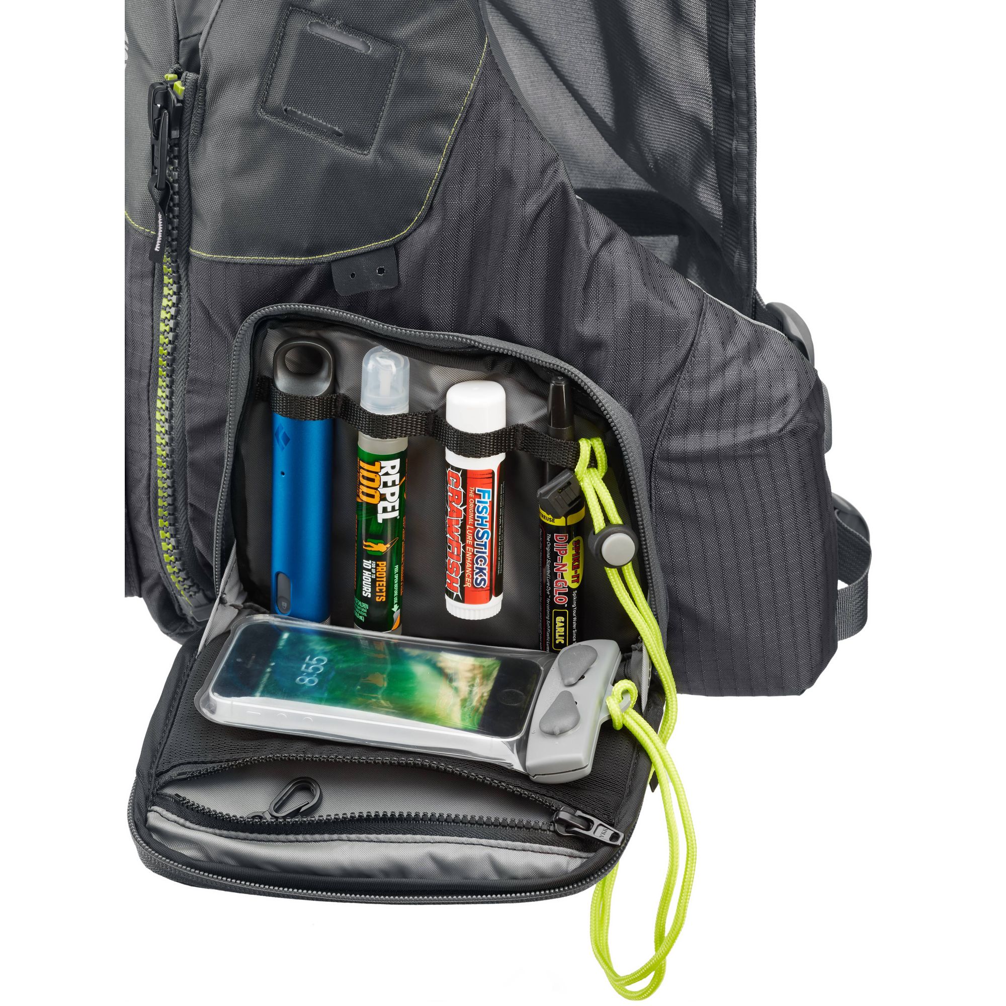 - Verfügt außerdem über einen Rutenhalter, einen Signalkörper (Blitzlicht) Befestigungspunkt, reflektierende Akzente und eine Messer Aufnahmepunkt.