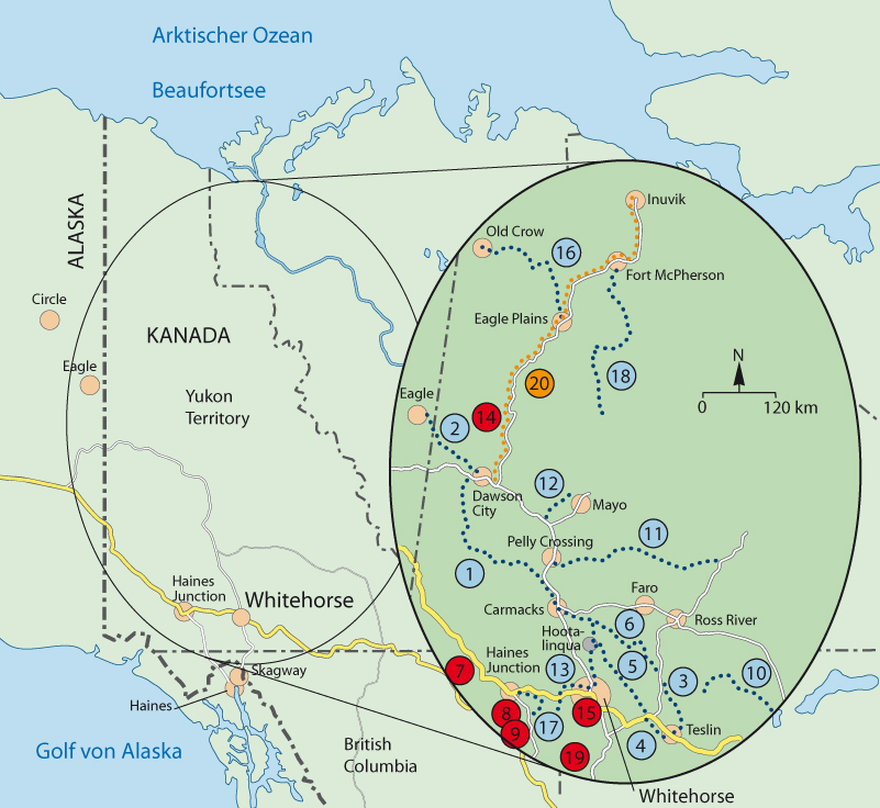Kanutouren: Yukon River, Nisutlin River, Teslin Lake, Teslin River, Big Salmon River, Upper Liard River, South MacMillan River, McQueston River, Takhini River, Porcupine River, Dezadeash River, Wind River.