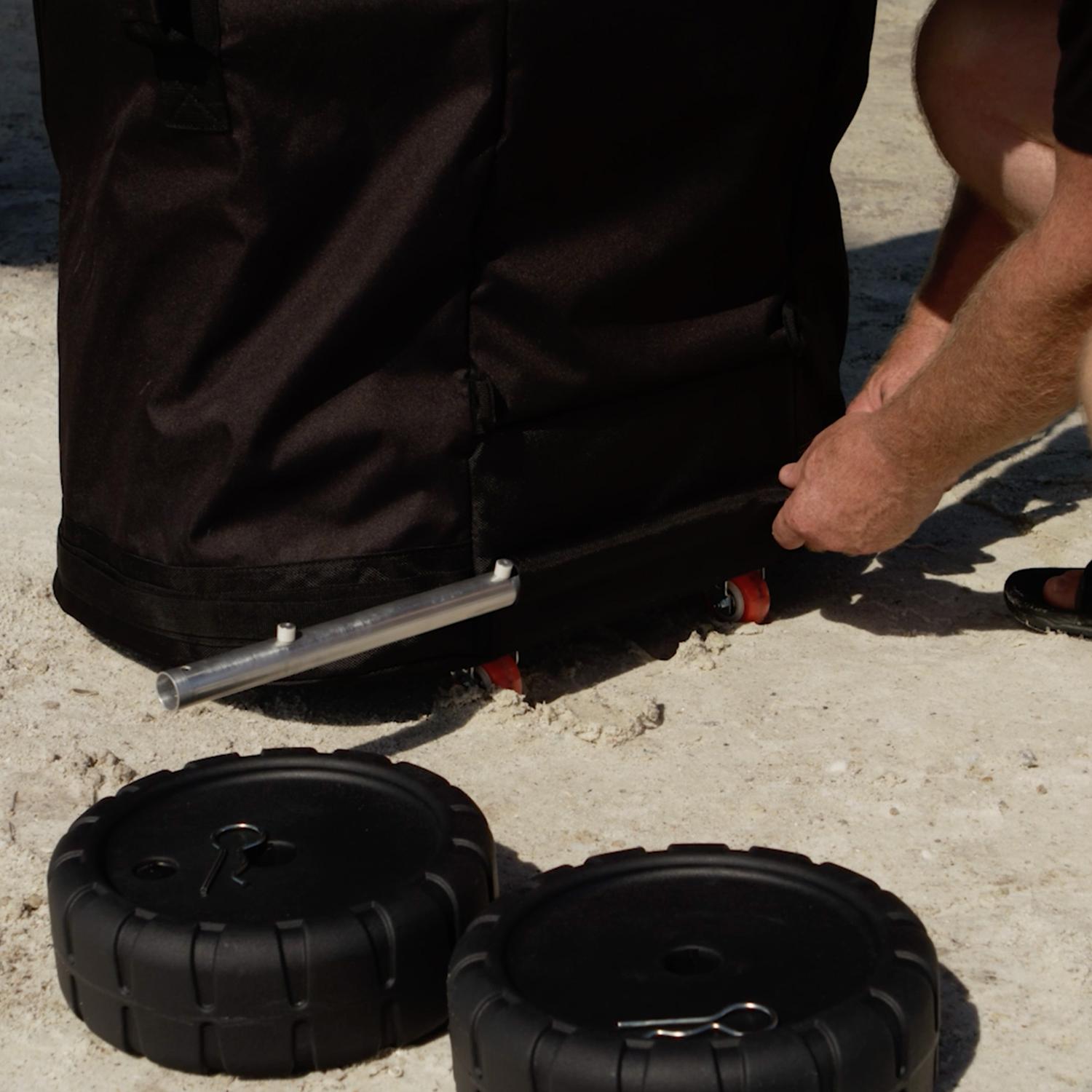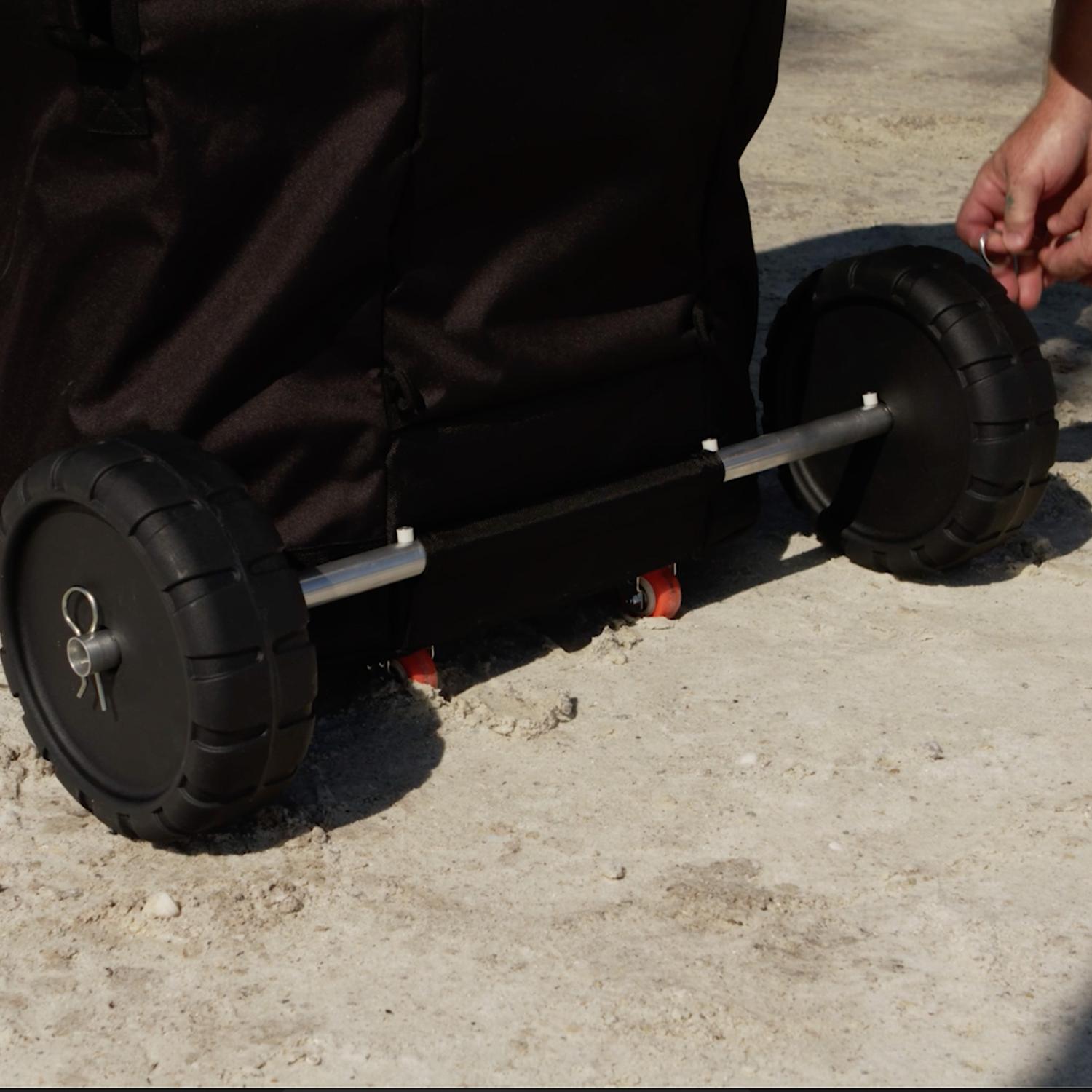Mit diesem praktischen All-Terrain-Radsatz verwandeln Sie Ihren Bluefin Bag in einen vielseitigen Rollwagen. Die robusten Räder bewältigen mühelos Sand, unebenes Gelände, Kies und sogar große Steine. Selbst das Rollen auf oder ab Treppenstufen ist problemlos möglich!