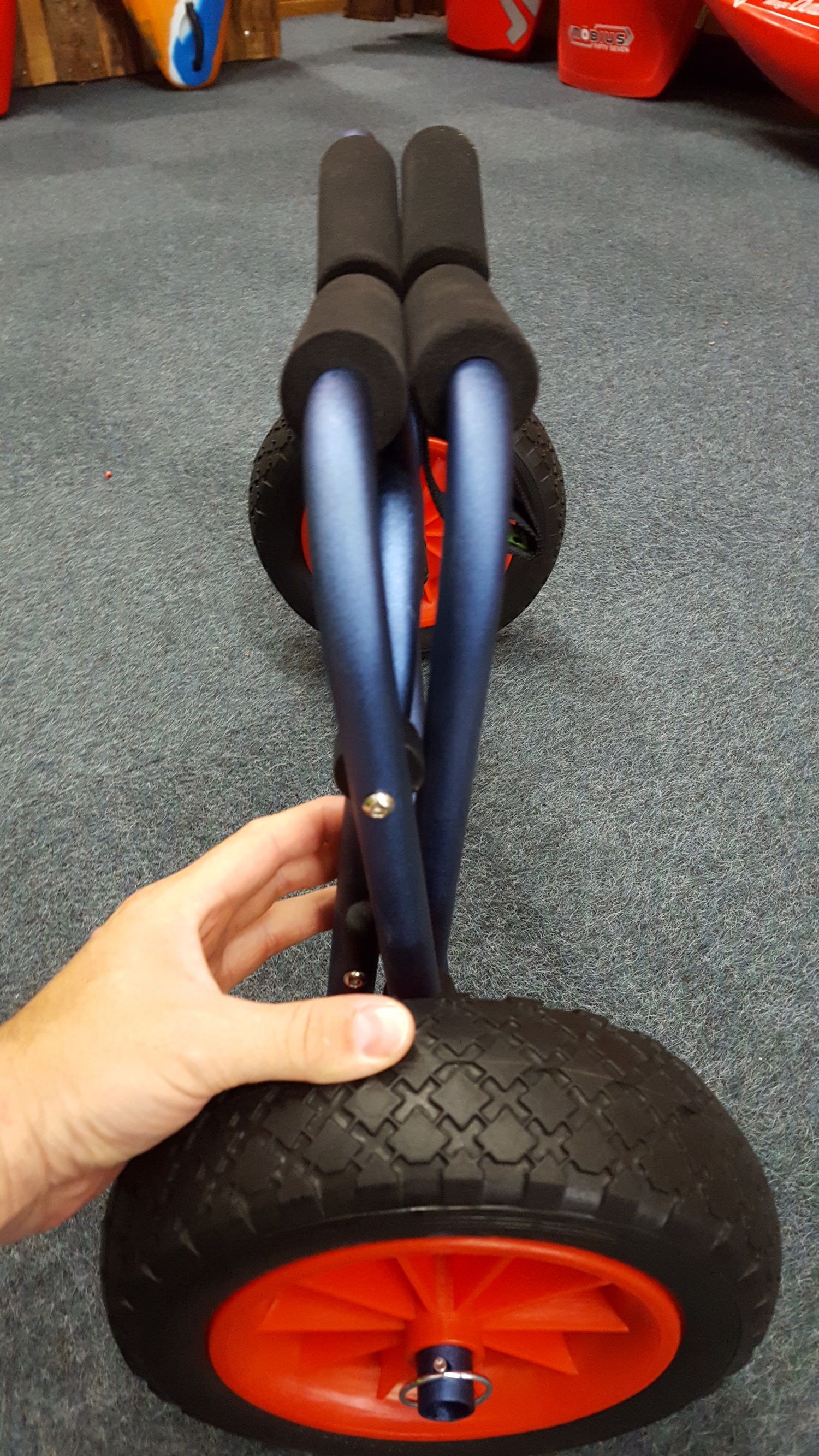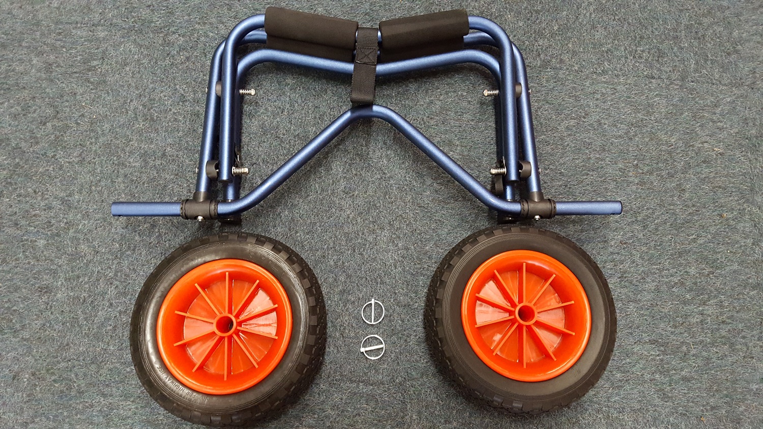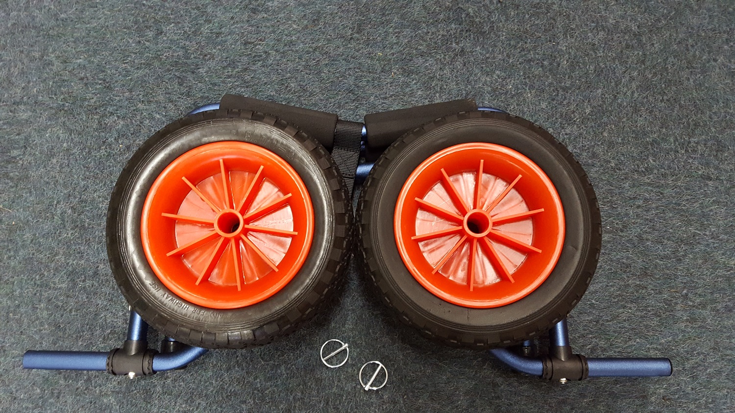 Die Vollgummi Reifen sind absolut Pannesicher und werden Kinderleicht mit einem Splint montiert, damit erreicht man ein handliches Pakmaß um den Bootswagen einfach verstauen zu können.