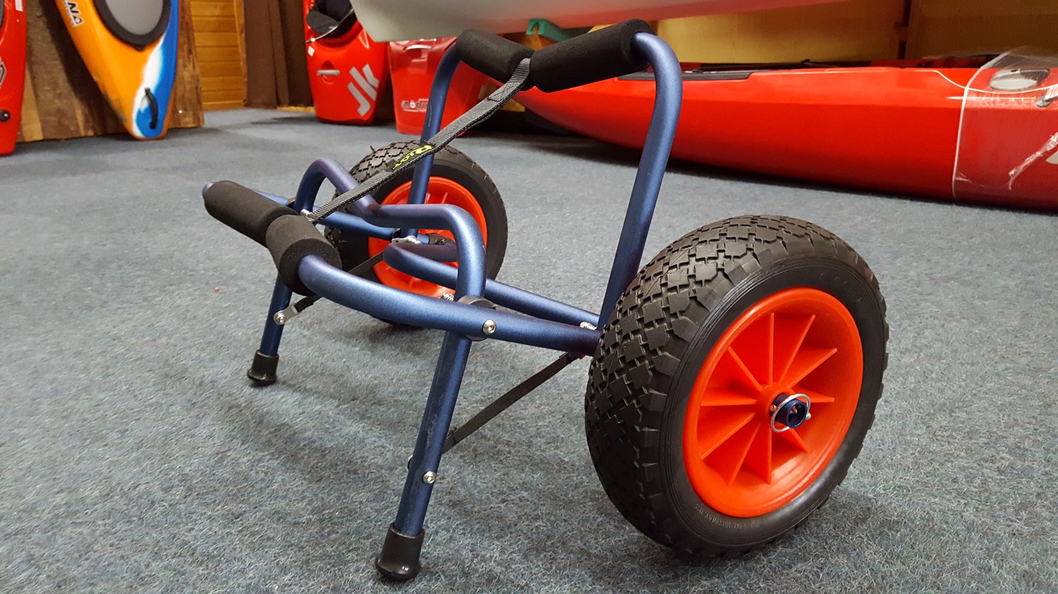 Preiswerter Bootswagen in guter Quallität. Optimal geeignet für Kanadier, 2 Sitzer Festrumpf Kajaks und nahezu alle Schlauchboote. Der Big Cart hat eine Auflage Breite von 46cm und eine Höhe von 35cm und bietet eine Tragkraft von 90kg.